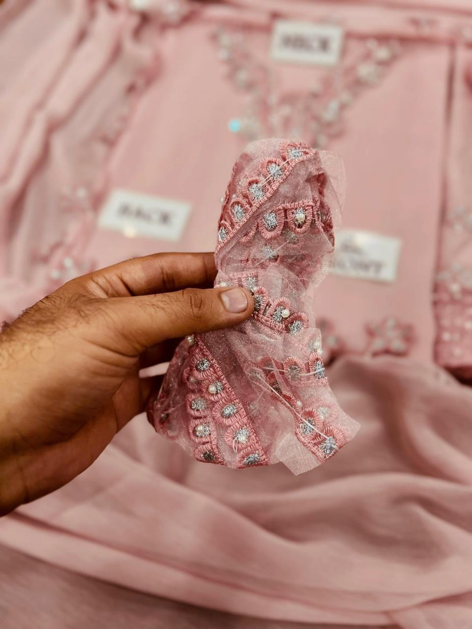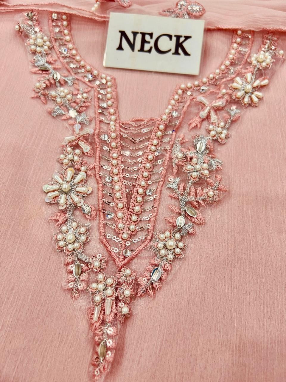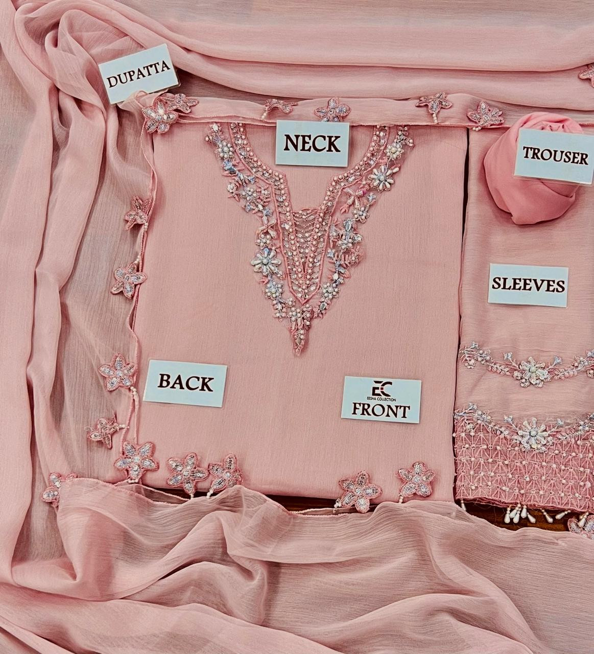 *Front*: Dyed chiffon with elegant embroidered neck patches & heavy adda work